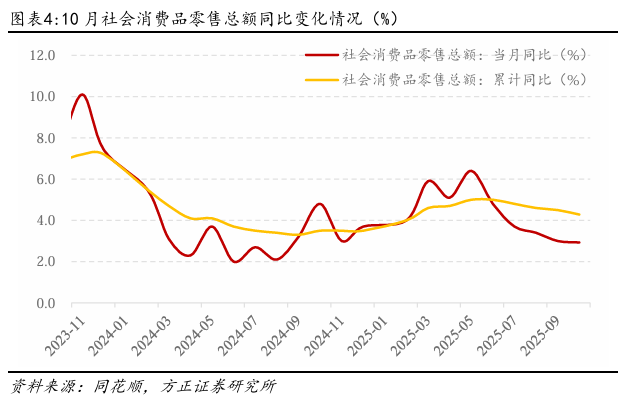 社零总量保持稳定,服务消费增长加快。2025年10月份,社会消费品零售总额46291亿元,同比增长2.9%,增速较9月放缓0.1个百分点,累计增速则为4.3%,较1-9月微降0.2%,核心受占比较大的汽车销售走弱影响。10月除汽车以外的消费品零售额42036亿元,同比增4.0%,增速较上月提升0.8%。
