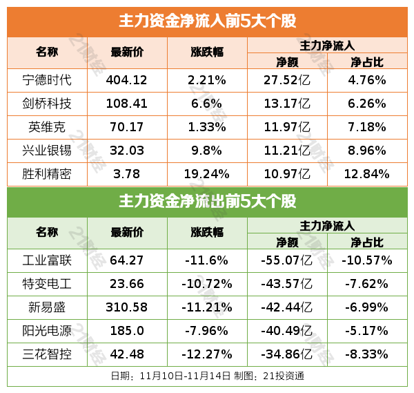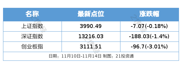 过去一周(11月10日—11月14日),A股三大指数集体下跌。截至11月14日收盘,上证指数报3990.49点,周跌0.18%;深成指报13216.03点,周跌1.40%;创业板指报3111.51点,周跌3.01%。