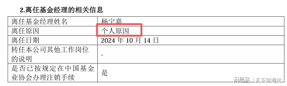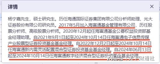 同花顺iFinD显示,杨宁嘉2017年5月加入海富通,历任股票分析师、高级股票分析师等职务,自2021年9月开始管理基金产品,直到2024年10月才离开公司。