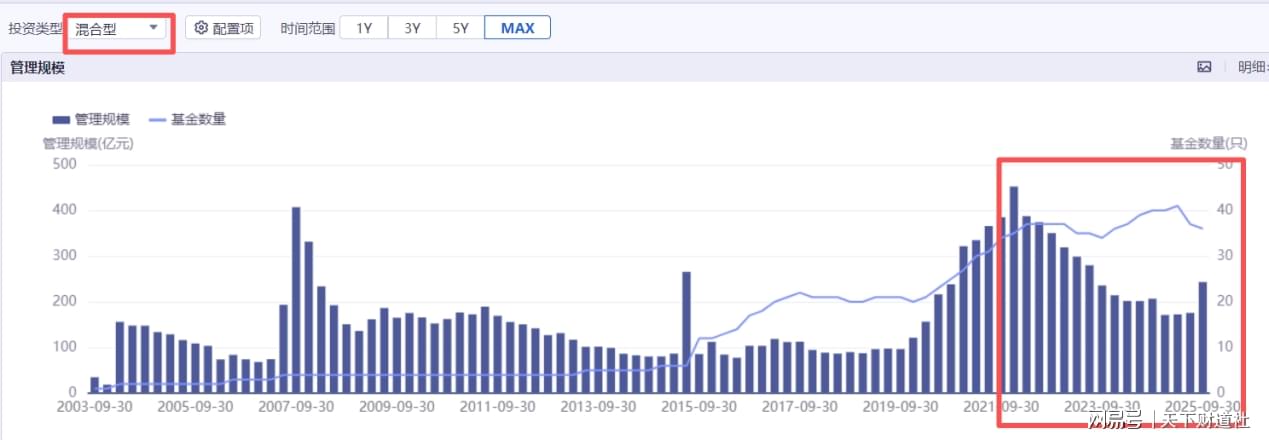 其中,混合型产品自2021年末便呈现持续下滑的态势,虽在今年三季度有所上升,但总体规模仍旧较低,今年二季度末,该产品类型的行业排名已在40名开外。