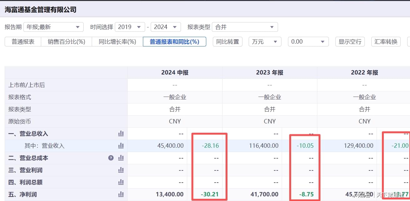 同花顺数据显示,2022年以来,海富通营业收入、净利润呈现持续下滑态势。虽因海通证券合并事项影响,无法查询2024年全年业绩,但当年中报显示,海富通营收和净利润降幅都在三成左右。