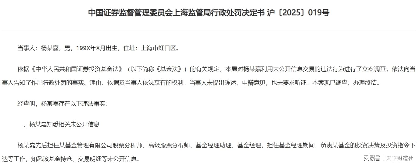 上海证监局处罚书显示,杨某嘉利用未公开信息明示、暗示他人从事相关交易活动,对杨某嘉责令改正,并处以罚款。