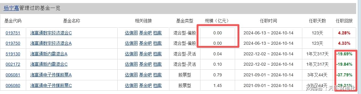 另外值得一提的是,杨宁嘉之前管理的基金,在任期间的收益回报均表现不佳——亏损约20%-40%,或许正是业绩的持续低迷,导致其管理规模皆较为"迷你"。
