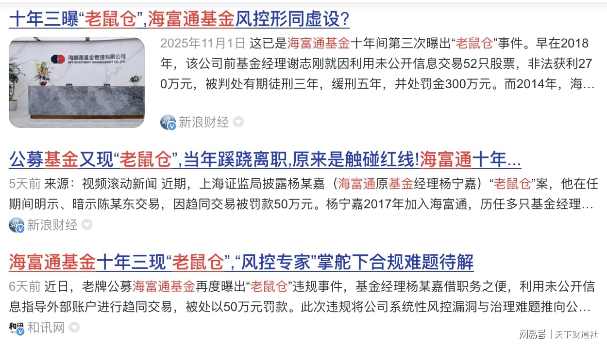 历史总在不经意间重演——查阅过往记录便能发现,这并非海富通首次因"老鼠仓"被推上风口浪尖,而是继2014年、2018年之后的第三起同类事件。即便前两次违规已时隔多年,但丑闻的重现,仍如一道久治不愈的伤疤,让公司治理漏洞再度展现在世人眼前。