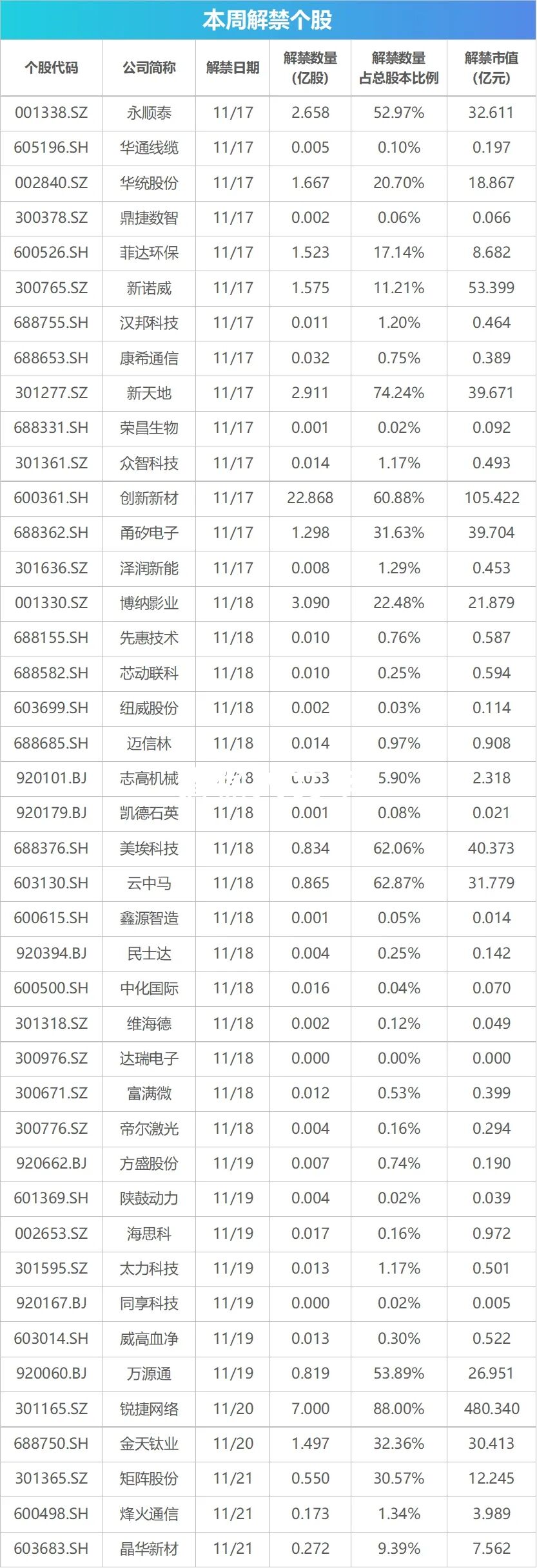 Wind数据统计显示,本周共有42只限售股解禁,按最新收盘价计算,解禁总市值为952.23亿元。