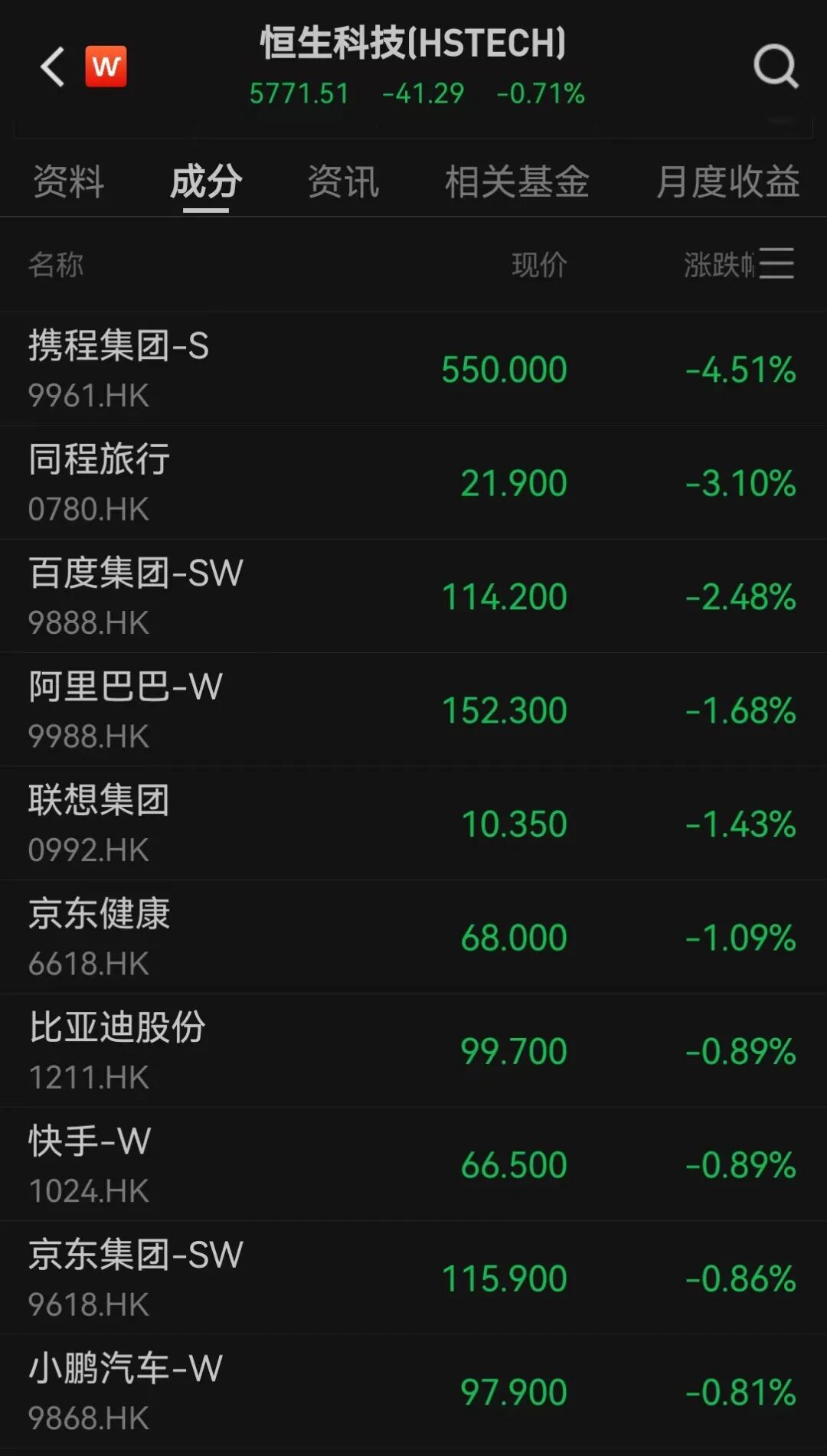 科技股普遍回调,百度集团跌超2%,阿里巴巴跌超1%。旅游股走低,携程集团跌超4%,同程旅行跌超3%。