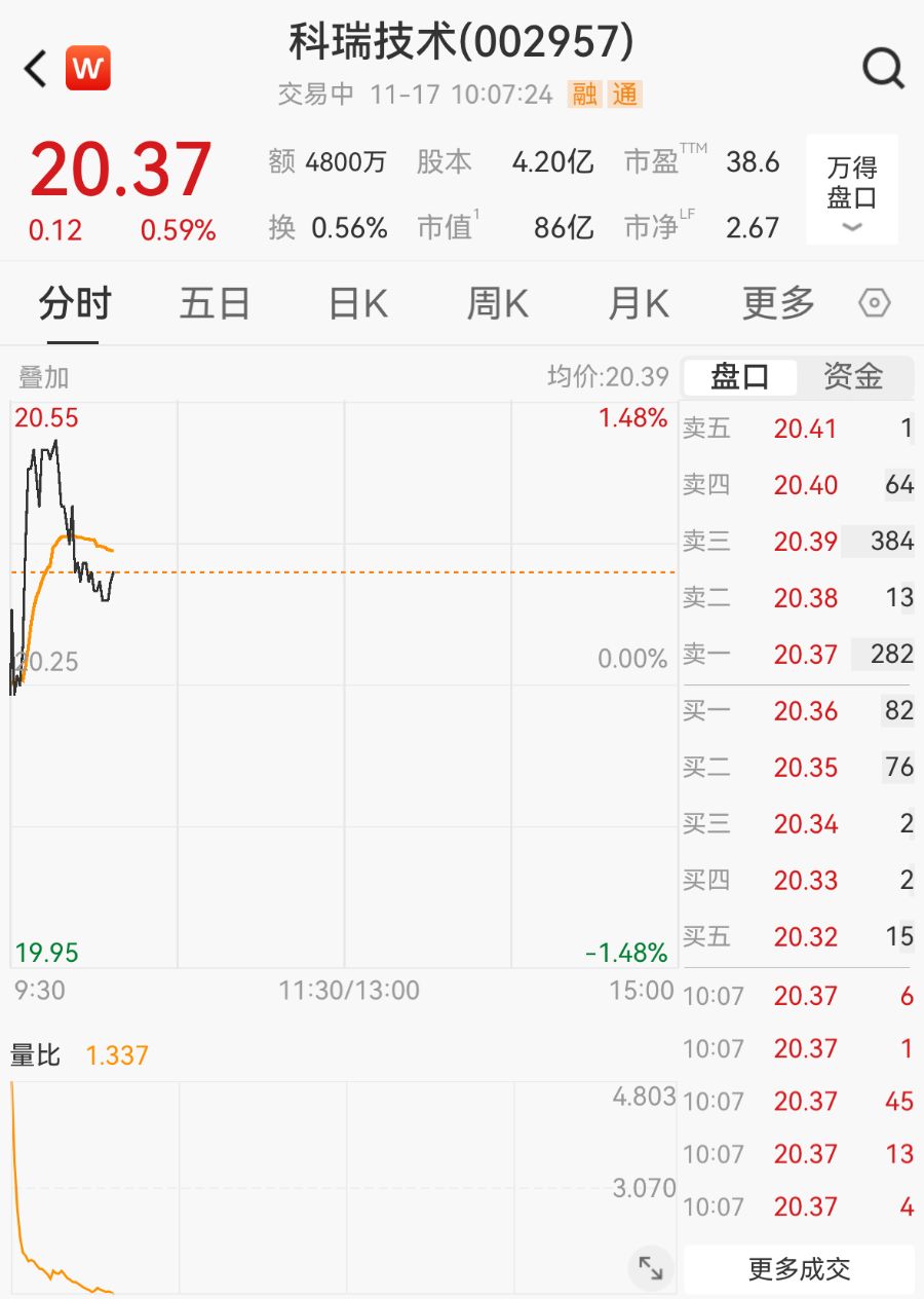 今天早盘,科瑞技术股价窄幅震荡,截至10:07,报20.37元/股,涨0.59%,总市值为86亿元。