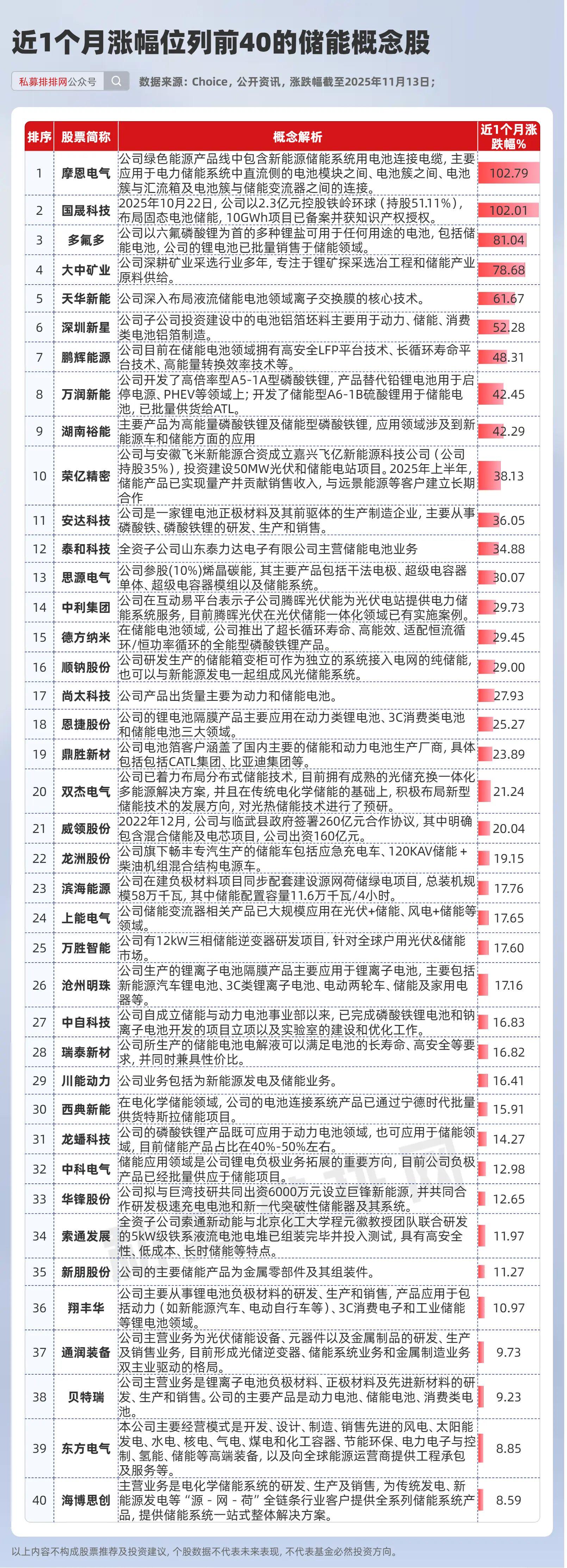 因此,笔者在新型储能概念的核心A股公司中,整理出近1个月涨幅居前40的公司,以供大家参考。