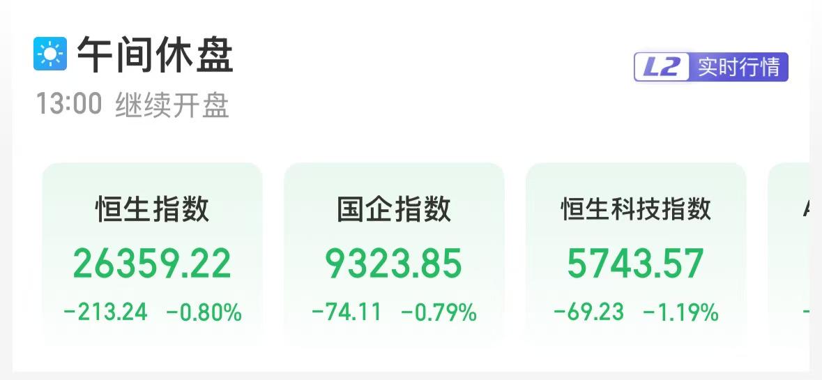 【恒生科技指数午盘收跌1.19%】17日午盘,香港恒生指数跌0.80%,报26359.22点;恒生科技指数跌1.19%,报5743.57点;恒生中国企业指数跌0.79%,报9323.85点。个股方面,天齐锂业涨超6%,联华超市涨超4%,万达酒店发展、汤臣集团涨超3%;携程集团跌超4%,联想集团、药明生物跌超3%。(中新经纬APP)