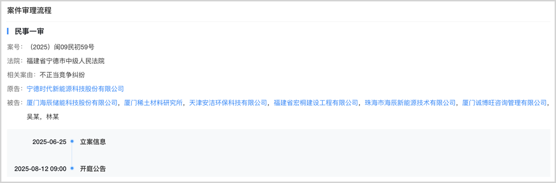 最新的一起也是金额最大的一起,是2025年6月,宁德时代将海辰储能及厦门稀土材料研究所等6名关联方,以“不正当竞争”为由,告至宁德市中级人民法院。