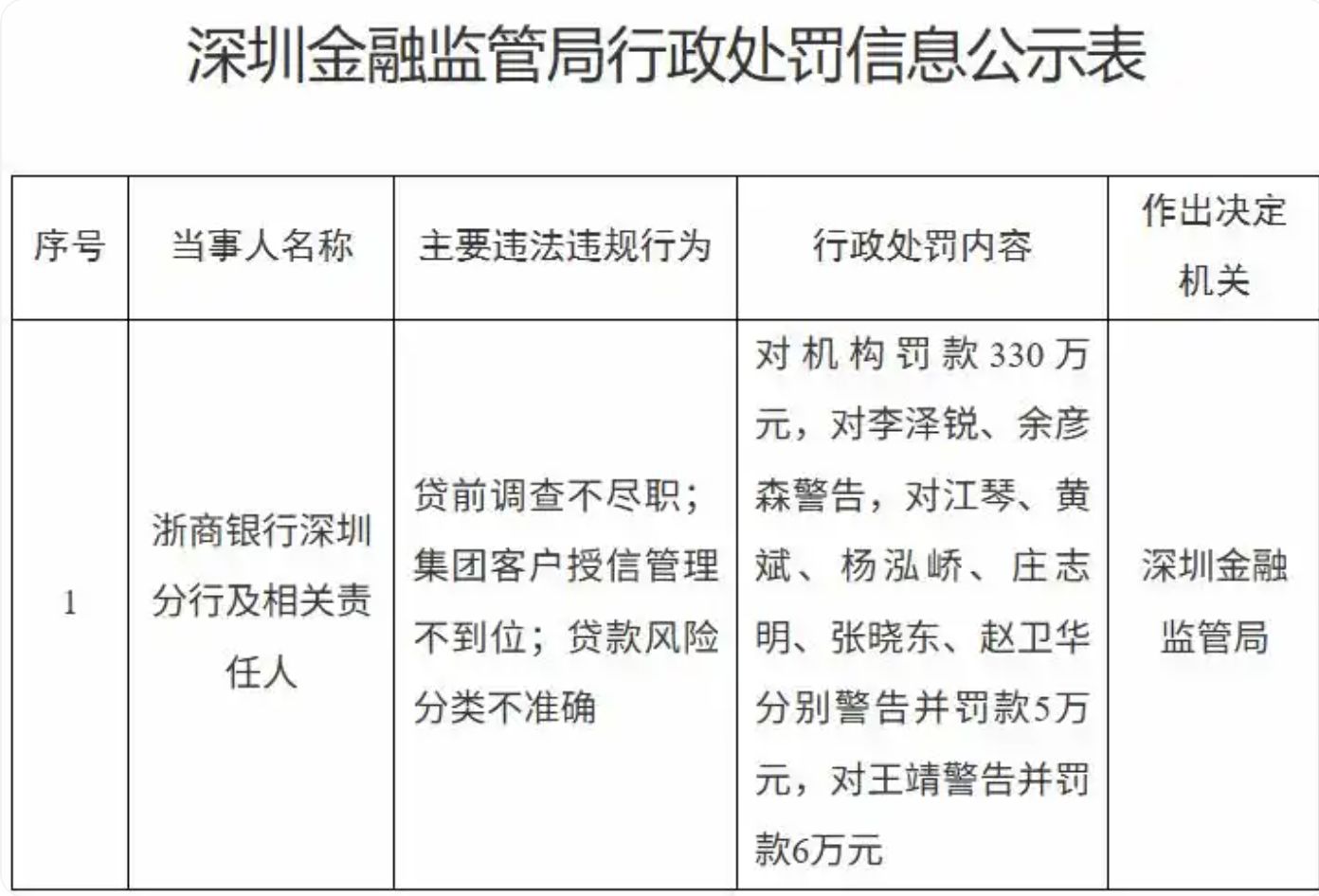 近日,深圳金融监管局向浙商银行深圳分行开出330万元罚单,多名相关责任人同时受到警告及罚款处分。