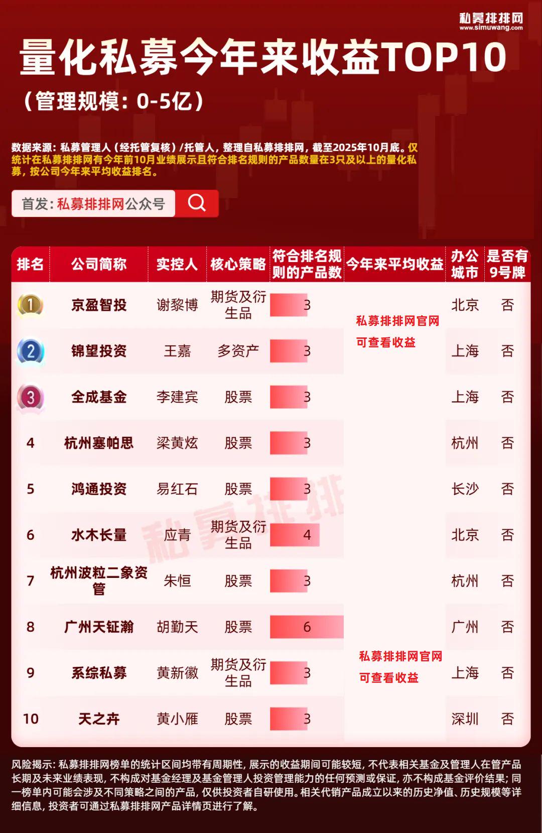 在规模为0-5亿的私募中,今年来收益10强的量化私募上榜“门槛”为***%。年内收益位列前3的分别是:京盈智投、锦望投资、全成基金。
