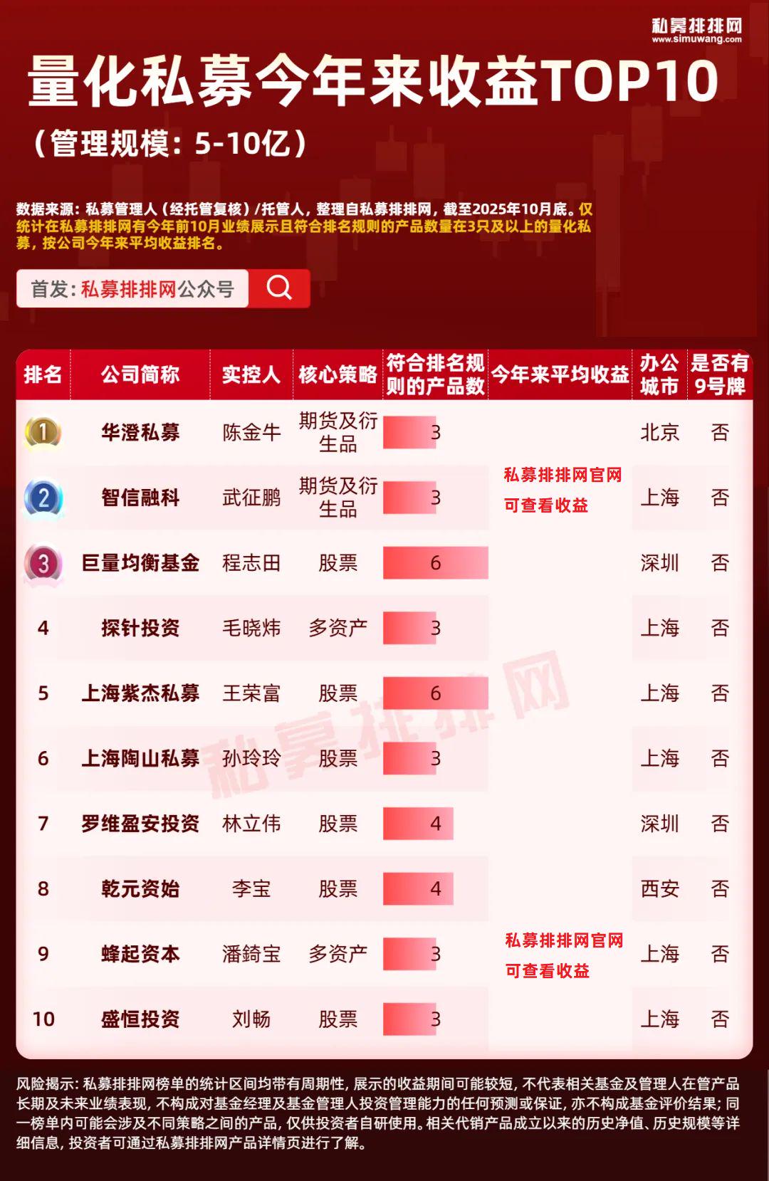 在规模为5-10亿的私募中,今年来收益10强的量化私募上榜“门槛”为***%。和9月底相比,规模有所跃升的私募有华澄私募、智信融科、探针投资3家。年内收益位列前3的分别是:华澄私募、智信融科、巨量均衡基金。