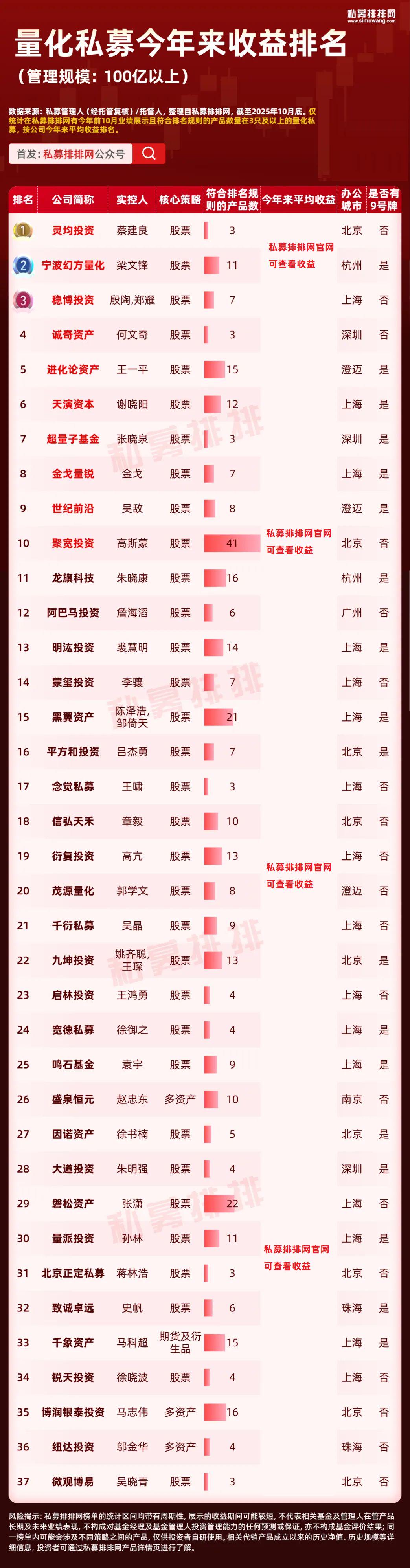 从业绩层面来看,旗下至少有3只产品符合排名规则的百亿量化私募共有37家,他们今年来的平均收益达到***%。其中,收益位列前10的有宁波幻方量化、稳博投资、诚奇资产、进化论资产、天演资本等私募。