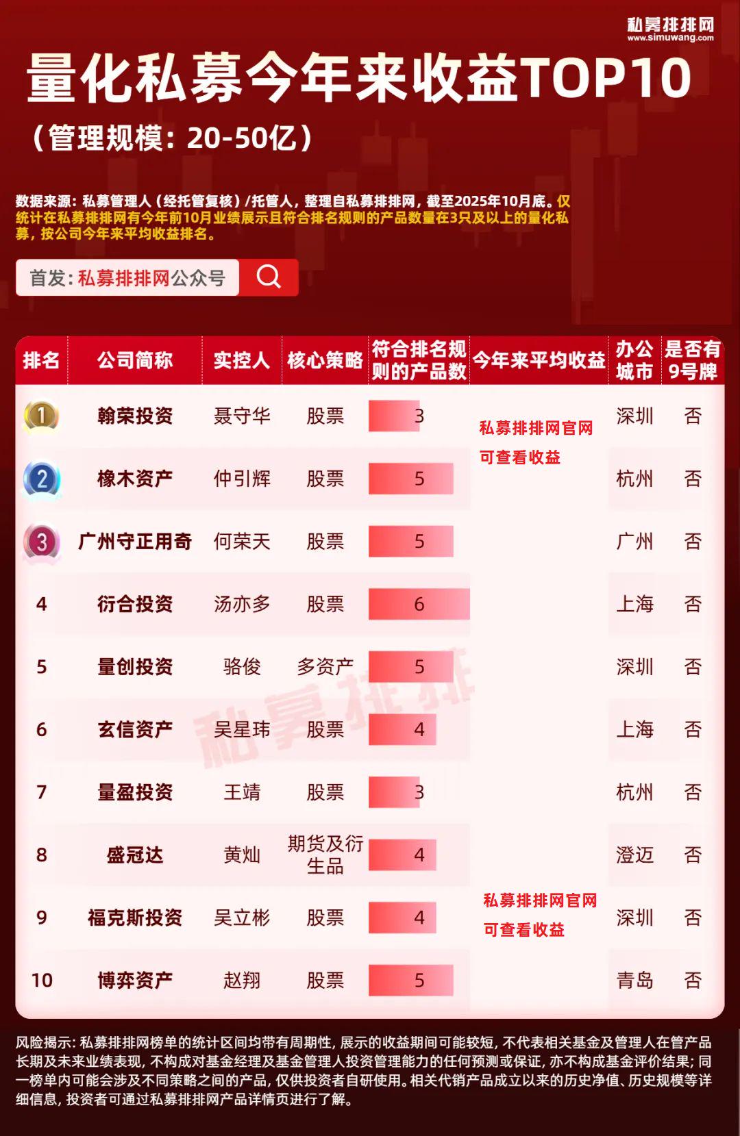 在规模为20-50亿的私募中,今年来收益10强的量化私募上榜“门槛”为***%。在10强量化私募中,10月规模实现跃升的私募共有4家,分别为翰荣投资、衍合投资、量创投资、玄信资产。年内收益位列前3的分别是:翰荣投资、橡木资产、广州守正用奇。