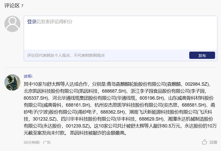 从网友发在财新评论区的截图来看,这12家企业均为行业内知名上市公司,包括青岛森麒麟(002984.SZ)、凯因科技(688687.SH)、李子园(605337.SH)、华通线缆(605196.SH)、威高骨科(688161.SH)、安杰思(688581.SH)、甬矽电子(688362.SH)、飞沃科技(301232.SZ)、华丰科技(688629.SH)、永达股份(001239.SZ)等。其中凯因科技被敲诈金额最高,永达股份的10万元在案发前未支付。