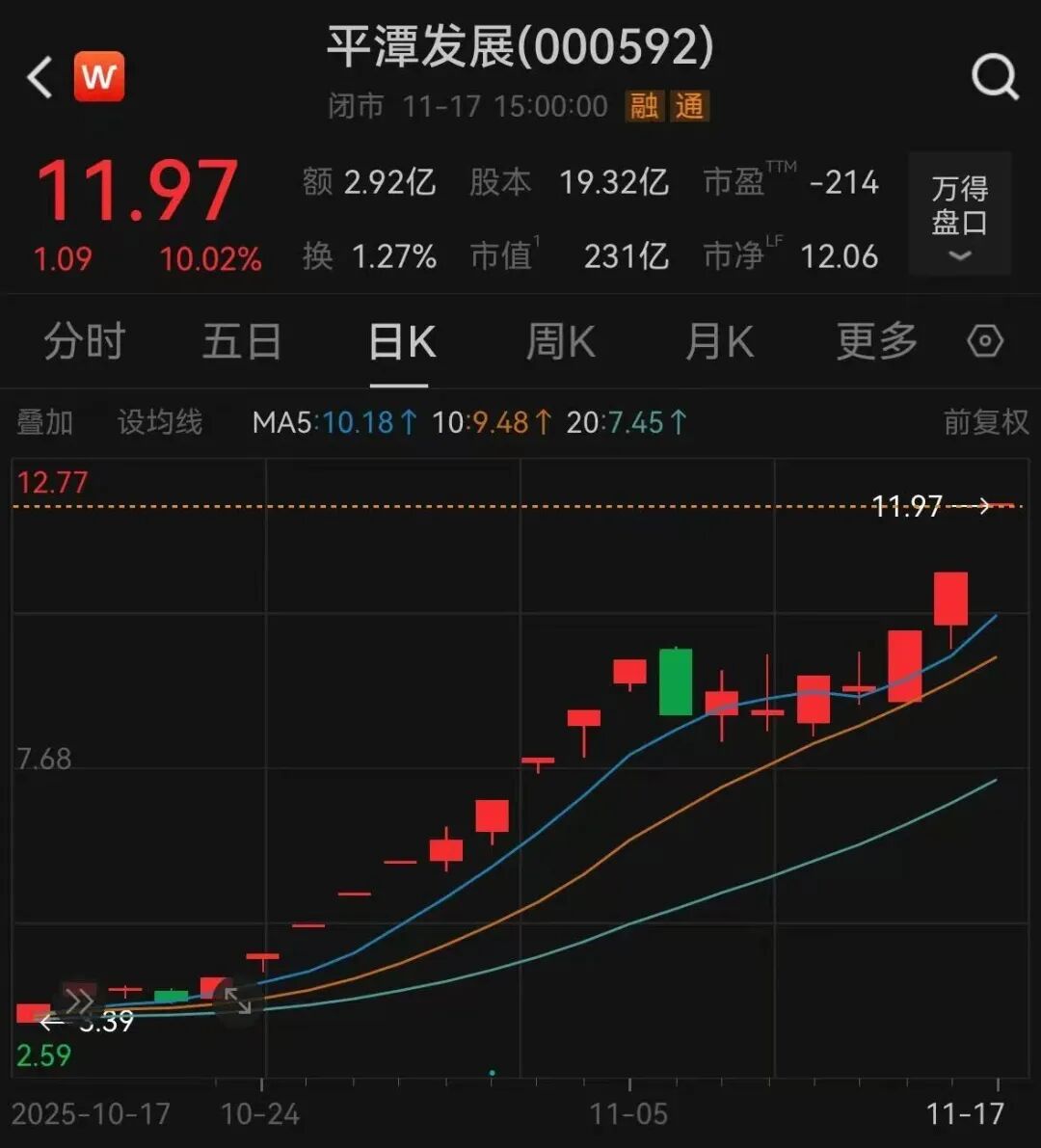 11月17日,平潭发展再度一字涨停,报11.97元/股。自10月17日上涨启动,该股走出“21天13板”行情,股价累计涨幅255.19%,总市值从65亿飙升至231亿。