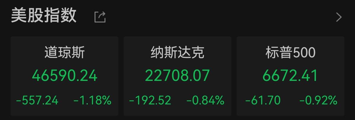 中新经纬11月18日电 美东时间周一,美股三大指数集体下跌。道指收跌557.24点,跌幅1.18%,报46590.24点;纳指收跌192.52点,跌幅0.84%,报22708.07点;标普500指数收跌61.70点,跌幅0.92%,报6672.41点。