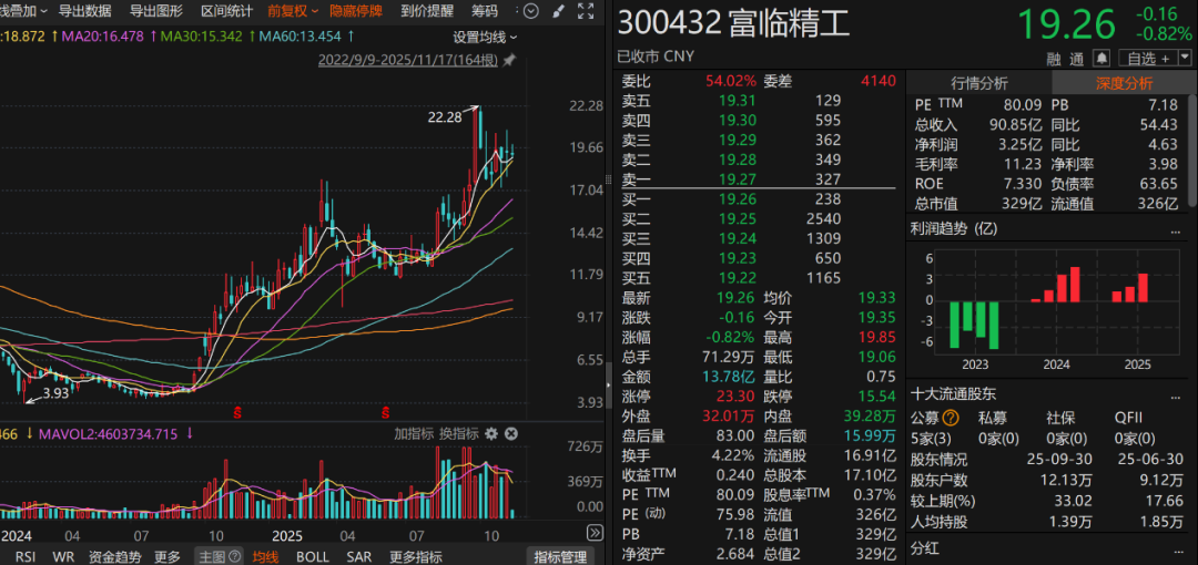 截至11月17日收盘,富临精工报19.26元/股,总市值为329亿元。