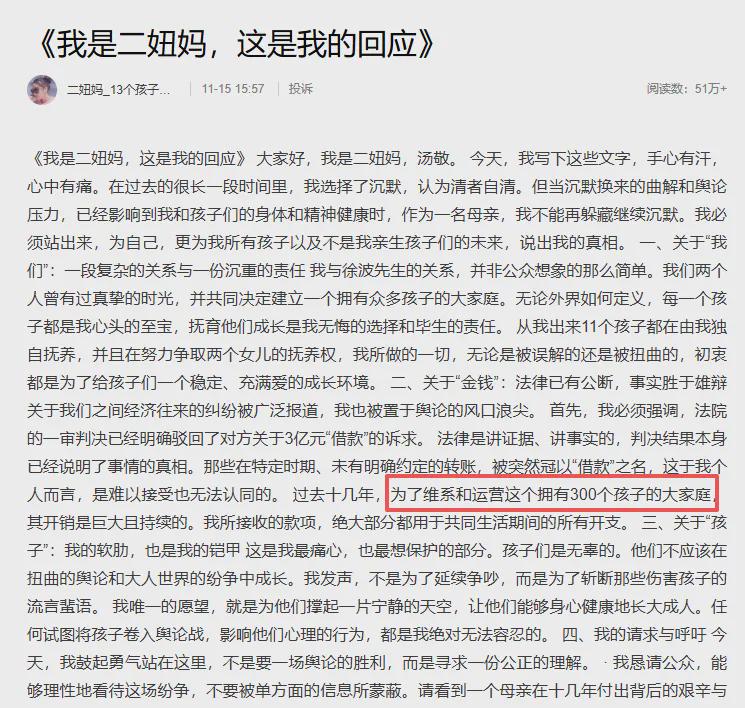 徐波的孩子问题已经完全超出家庭伦理,直接陷入法律和社会争议的深渊。据徐波前伴侣汤敬(二妞妈)在2025年11月15日的公开声明,他通过捐精、代孕等方式在全球生育了超过300名子女,组成了一个堪称“大型实验式家庭”。