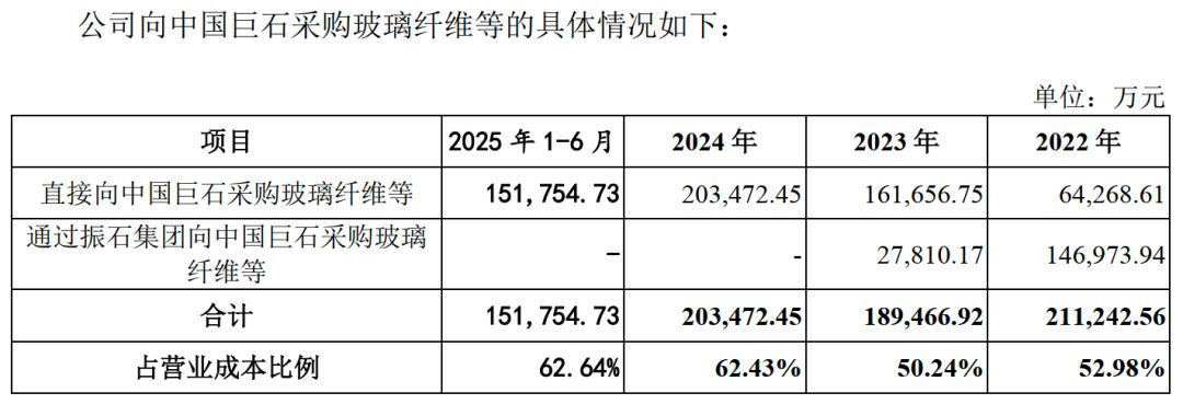其中,2022年-2024年及2025年上半年,振石股份直接及通过振石集团向中国巨石的采购额分别为21.12亿元、18.95亿元、20.35亿元和15.18亿元,占营业成本比例分别为52.98%、50.24%、62.43%和62.64%,是绝对的主力供应商。