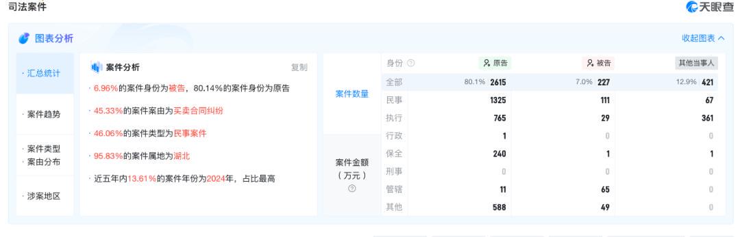 与此同时,九州通的“万店计划”仍面临诸多挑战,其中最突出的是合规问题与盈利质量的隐忧。天眼查数据显示,在相关案件中,九州通有6.96%的案件身份为被告;从案由来看,45.33%的案件涉及买卖合同纠纷。而在近五年的案件中,2024年的案件占比最高,达13.61%。