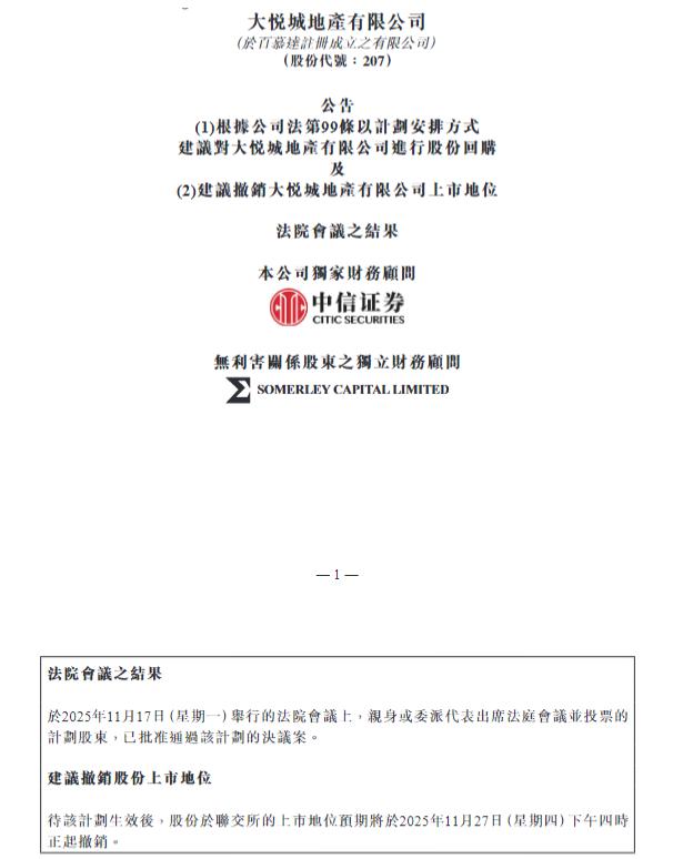 具体来看,公告显示,大悦城地产于2025年10月24日发布的计划文件,内容有关根据公司法第99条以计划安排方式建议对本公司进行股份回购及建议撤销本公司上市地位。于2025年11月17日(星期一)举行的法院会议上,亲身或委派代表出席法庭会议并投票的计划股东,已批准通过该计划的决议案。建议撤销股份上市地位待该计划生效后,股份于联交所的上市地位预期将于2025年11月27日(星期四)下午四时正起撤销。