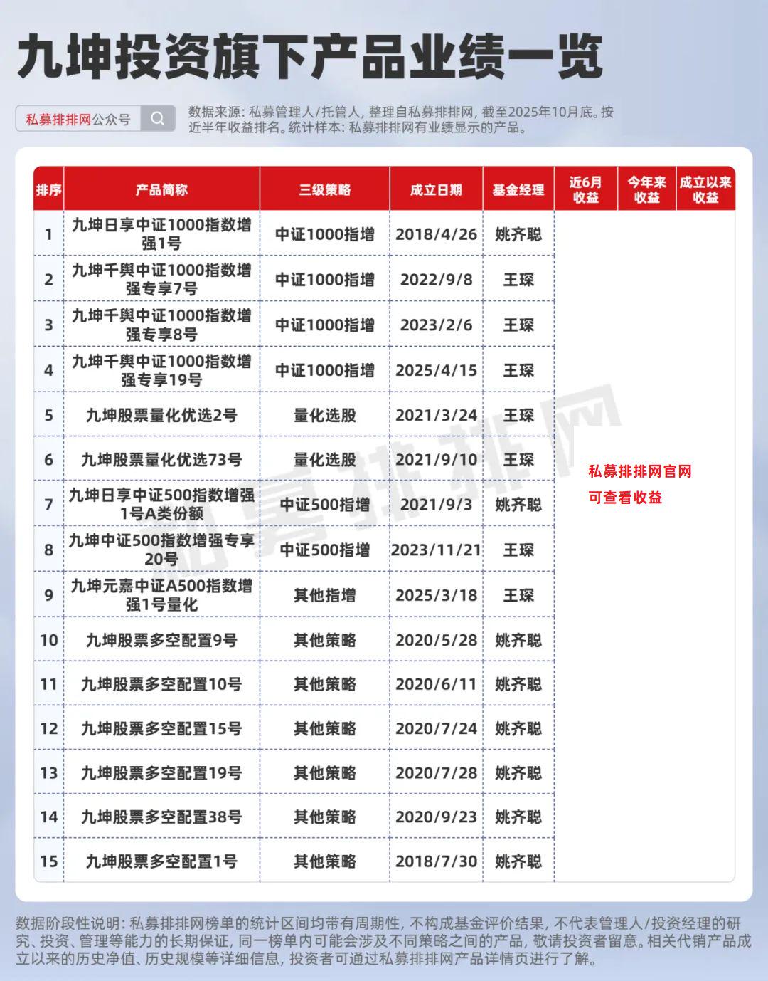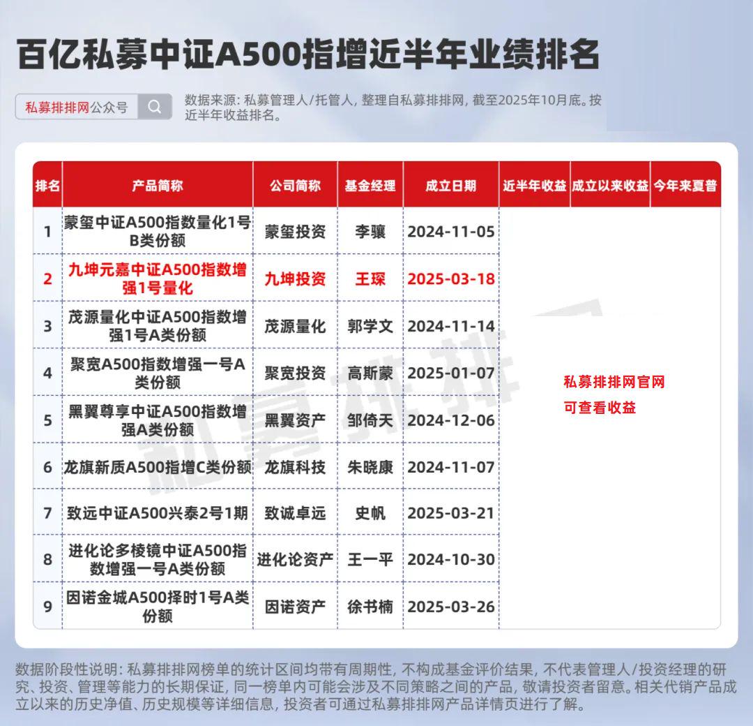 自去年9月23日A500指数发布以来, A500相关指增产品陆续发行。其中,国内四大量化天王之一的九坤投资,在今年3月份成立“九坤元嘉中证A500指数增强1号量化”,截至10月底,该产品近6个月已实现***%的亮眼业绩,在百亿私募A500指增榜中,位居第2。