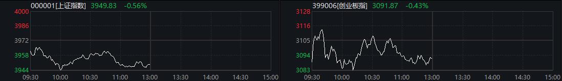 中新经纬11月18日电 18日,A股三大股指延续调整。截至午盘,上证指数跌0.56%报3949.83点,深证成指跌0.43%报13145.00点,创业板指跌0.43%报3091.87点。