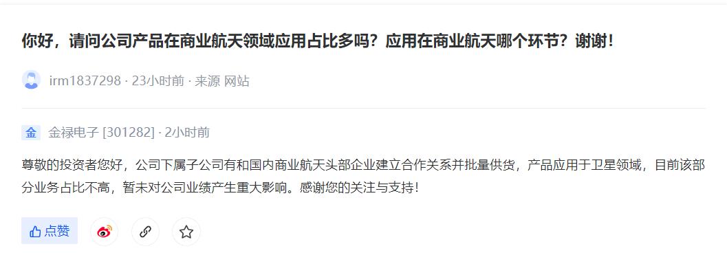 【V观财报|金禄电子:下属子公司有向国内商业航天头部企业批量供货】金禄电子11月18日在投资者互动平台表示,公司下属子公司有和国内商业航天头部企业建立合作关系并批量供货,产品应用于卫星领域,目前该部分业务占比不高,暂未对公司业绩产生重大影响。(中新经纬APP)