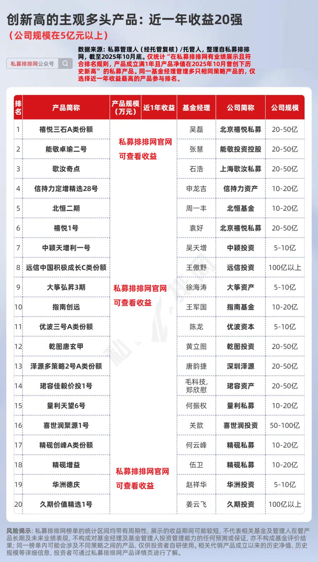据私募排排网数据,来自5亿以上规模私募的创新高产品中,核心策略为“股票-主观多头”的产品共有422只。根据上文规则,笔者筛选出了“创新高的主观多头产品近一年收益20强”,上榜“门槛”超***%。百亿私募中,远信投资、久期投资各有1只产品上榜。