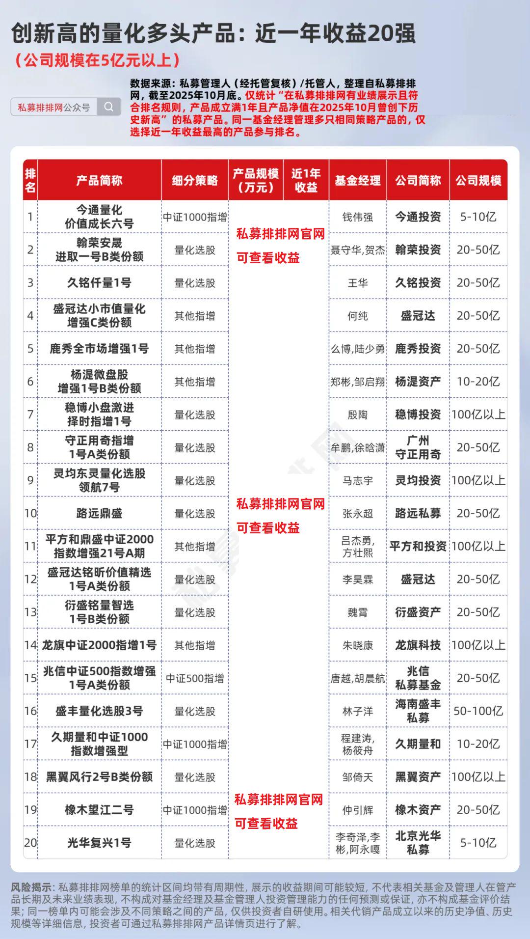 其中,量化私募巨头宁波幻方量化,有11只私募产品在私募排排网有业绩展示且成立满1年,近一年收益均值接近***%,在全部产品(5只以上)创新高私募中位列第5;今年1-10月的收益均值接近***%。