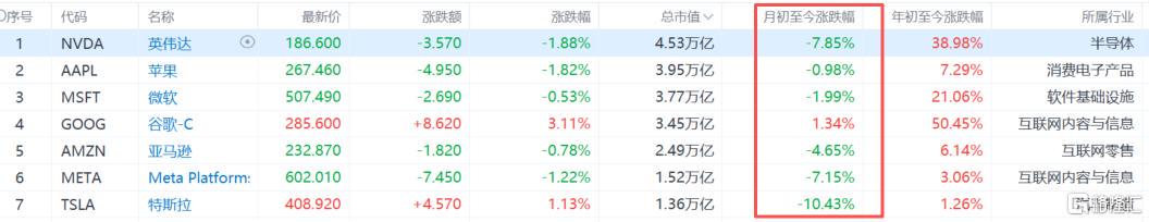 不过本月迄今,美股“七巨头”涨势停滞,特斯拉已累跌超10%,Meta、英伟达均累跌超7%,仅谷歌母公司Alphabet逆势上扬。