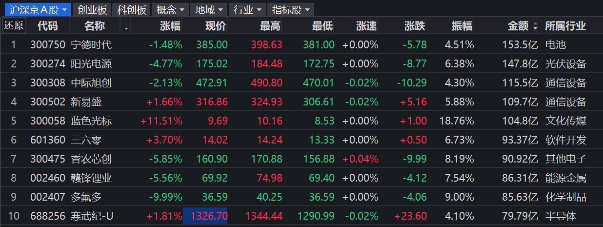 宁德时代成交额居首,为153.5亿元。其后是阳光电源、中际旭创、新易盛、蓝色光标,成交额分别为147.8亿元、115.6亿元、109.7亿元、104.8亿元。