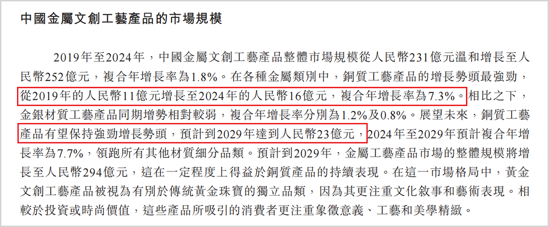 具体来看,2024年整个铜质文创工艺产品市场规模仅为16亿元,即便到2029年,预计也仅增长至23亿元。