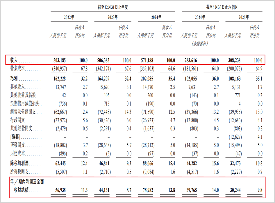 在小米系资本的支持下,铜师傅的整体经营迈上了新台阶。根据弗若斯特沙利文报告,按2024年的收入计算,铜师傅在中国铜质文创工艺产品市场按总收入计位列第一,市场份额达到了35.0%。招股书显示,2022至2025年6月底(简称:报告期),铜师傅的营收分别为5.03亿元、5.06亿元、5.71亿元和3.08亿元,同期净利润分别为0.57亿元、0.44亿元、0.79亿元和0.30亿元。