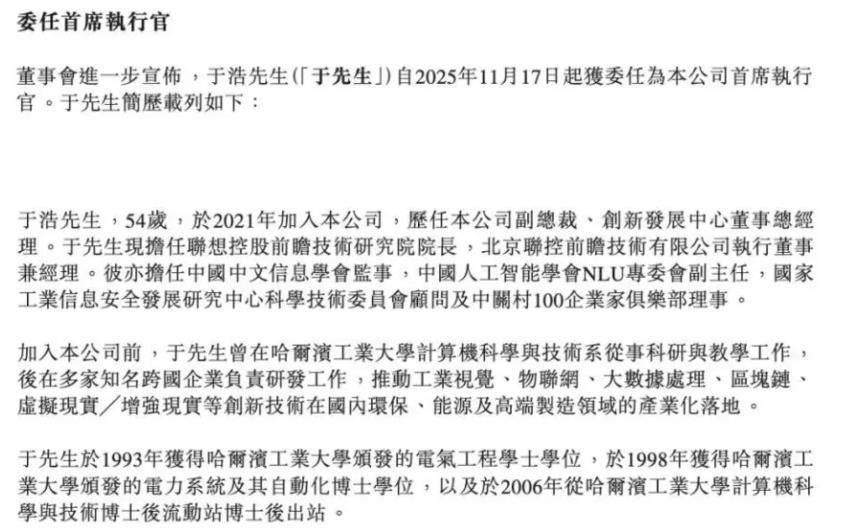 据联想控股的公告,委任于浩为新CEO,自2025年11月17日起接任,在公告中,联想控股还一并附上了于浩的履历: