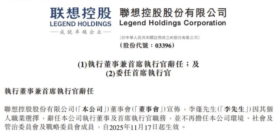 11月17日,联想控股发布公告,宣布公司核心人事的调整:原CEO李蓬因个人职业选择,辞任公司执行董事及首席执行官职务,并不再担任公司环境、社会及管治委员会及战略委员会成员,自2025年11月17日起生效。