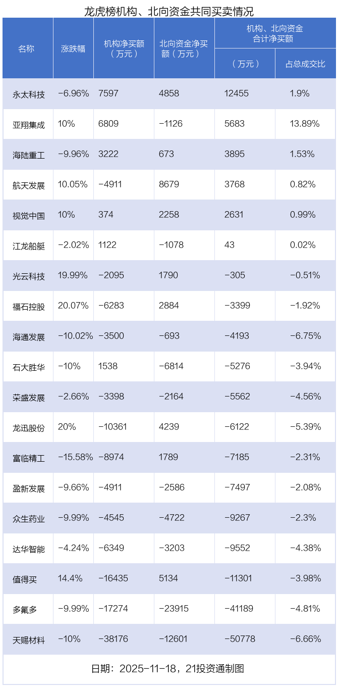 值得注意的是,机构和北向资金共同净买入了永太科技、视觉中国、海陆重工等3股;共同净卖出了海通发展、荣盛发展、盈新发展、达华智能、众生药业、天赐材料、多氟多等7股;在航天发展、值得买、龙迅股份、福石控股、光云科技、富临精工、江龙船艇、亚翔集成、石大胜华上出现分歧,机构净卖出航天发展4910.63万元,北向资金净买入8678.57万元;机构净卖出值得买1.64亿元,北向资金净买入5134.1万元;机构净卖出龙迅股份1.04亿元,北向资金净买入4238.73万元;机构净卖出福石控股6282.91万元,北向资金净买入2884.17万元;机构净卖出光云科技2094.93万元,北向资金净买入1790.14万元;机构净卖出富临精工8974.3万元,北向资金净买入1789.26万元;机构净买入江龙船艇1121.77万元,北向资金净卖出1078.36万元;机构净买入亚翔集成6809.32万元,北向资金净卖出1125.89万元;机构净买入石大胜华1538.12万元,北向资金净卖出6814.2万元。