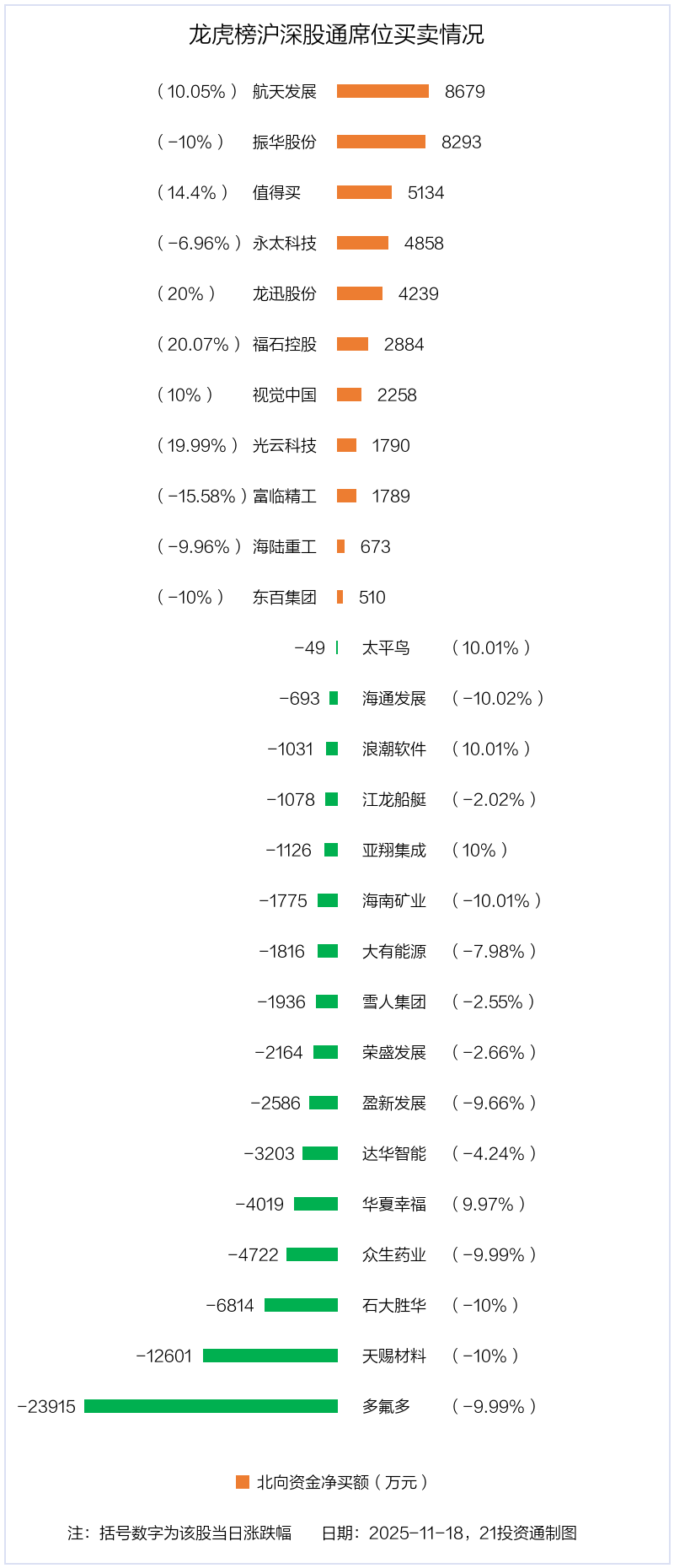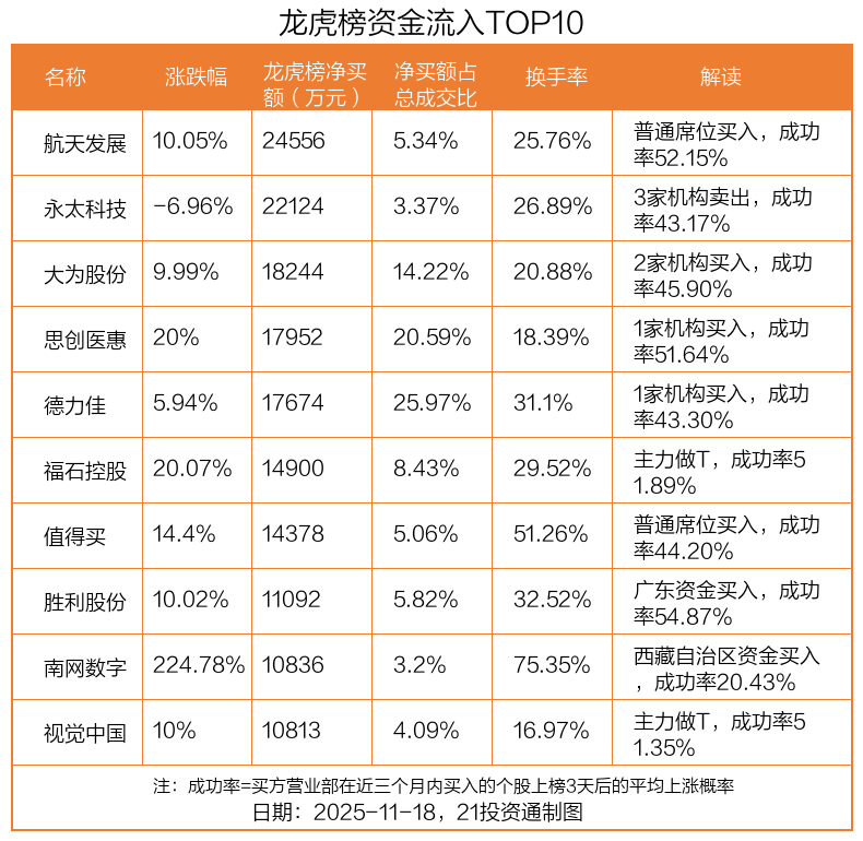 11月18日,上证指数下跌0.81%,深证成指下跌0.92%,创业板指下跌1.16%。盘后龙虎榜数据显示,共有53只个股因当日异动登上龙虎榜,资金净流入最多的是航天发展(000547.SZ),达2.46亿元。