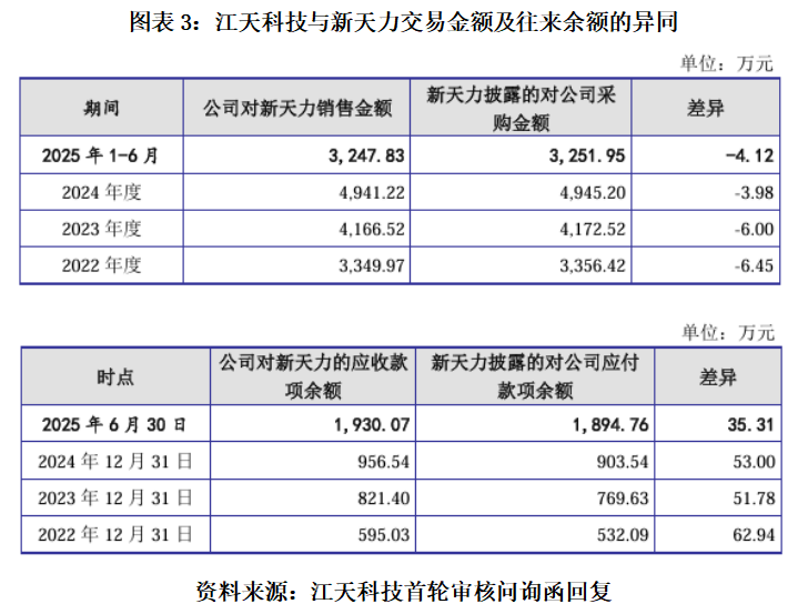 需要注意的是,报告期各期,在江天科技、新天力披露的相关交易数据中,双方在购销金额、往来余额方面均存在一定程度的差异。