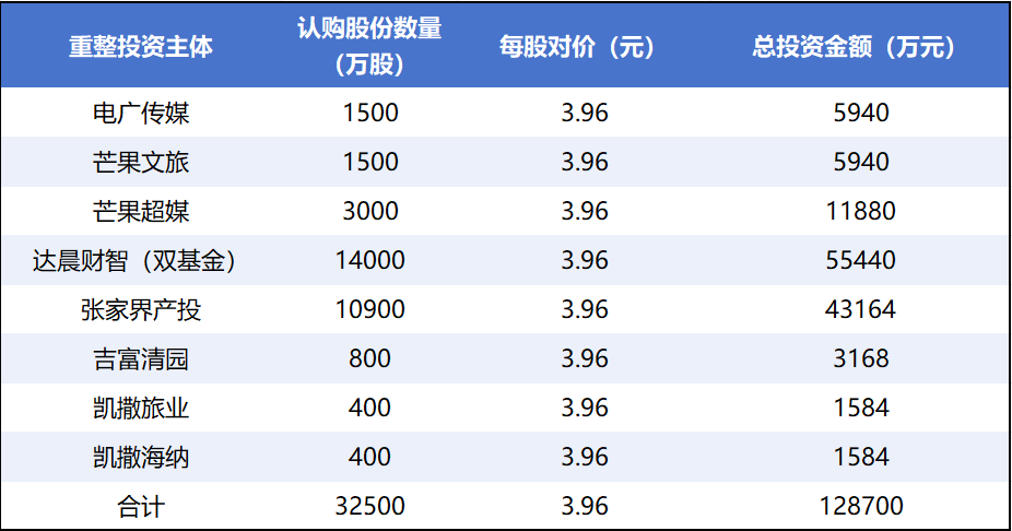 公告显示,张家界与电广传媒(000917.SZ)、芒果文旅、芒果超媒(300413.SZ)、达晨财智、张家界产投、吉富清园、凯撒旅业(000796.SZ)、凯撒海纳等投资人签署协议,上述投资人将以3.96元/股的对价,认购公司3.25亿股股份,总投资金额约12.87亿元。