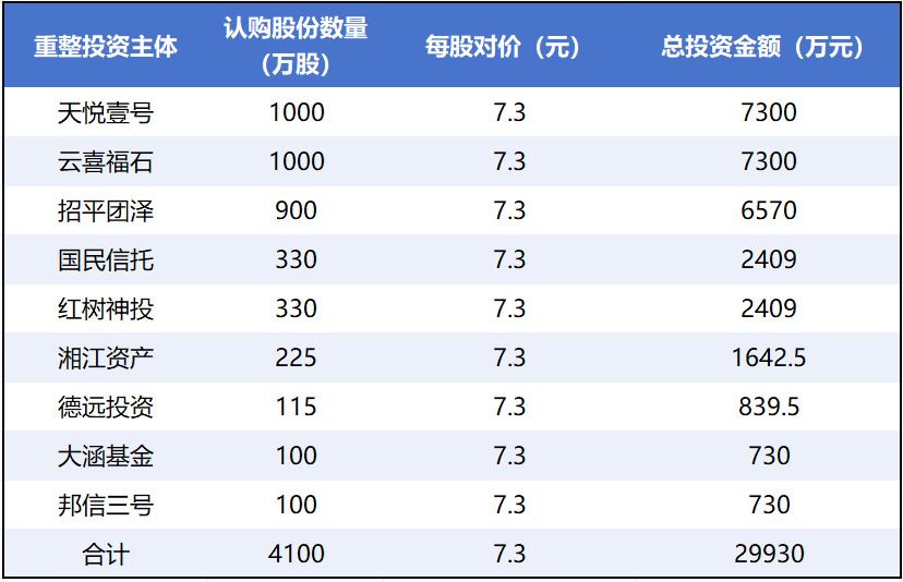 此前一日,张家界公布了部分重整投资人名单。公告显示,公司与上海天悦壹号企业管理中心(有限合伙)、海南云喜福石信息咨询合伙企业(有限合伙)、深圳市招平团泽投资合伙企业(有限合伙)等9家机构签署了协议,上述投资者将以7.3元/股的价格受让张家界股票,合计认购4100万股,投资2.99亿元。