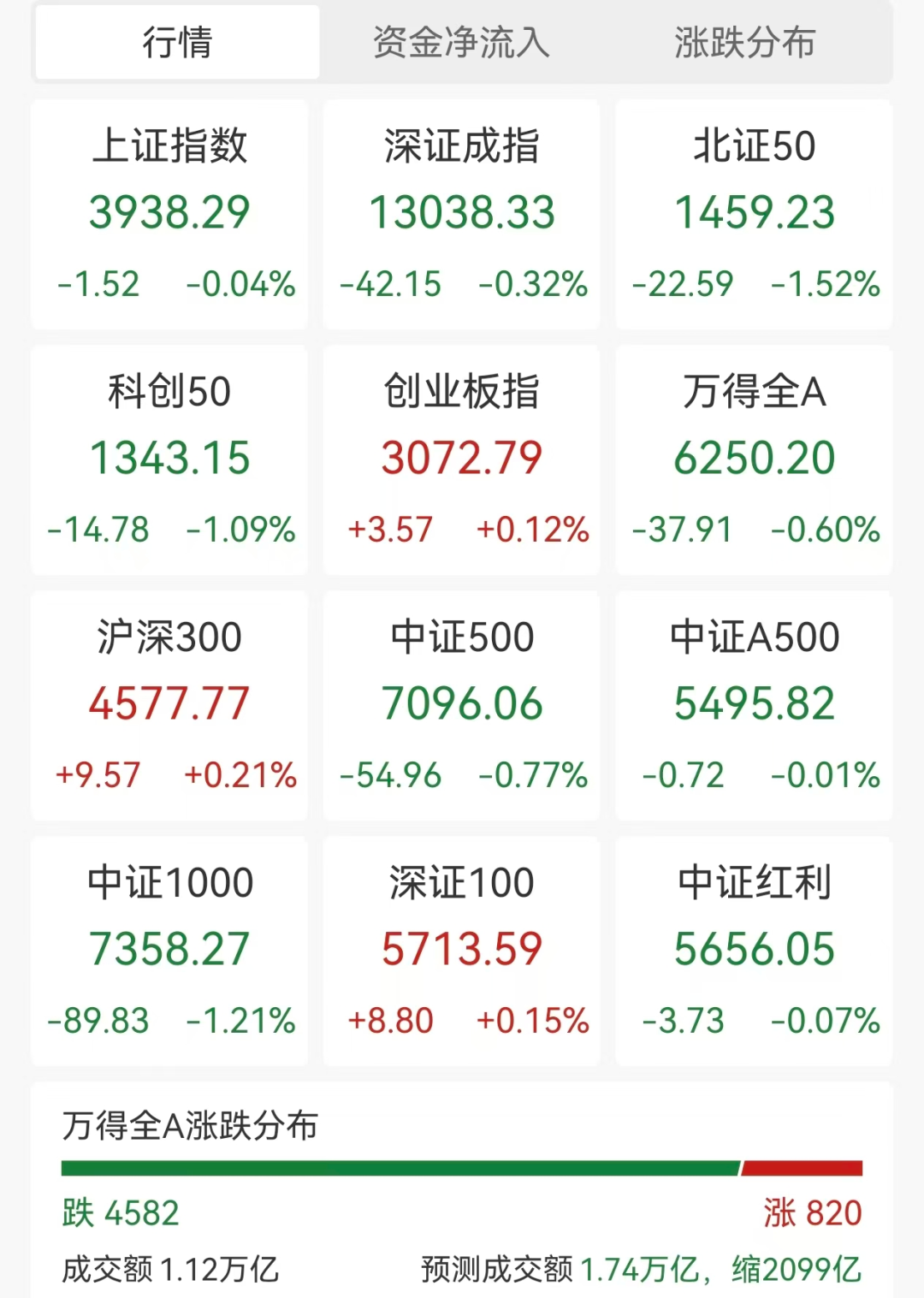 11月19日,A股三大指数涨跌不一,截至中午收盘,沪指冲高回落跌0.04%,创业板指一度涨超1%。中小盘股普跌,微盘股指数跌超2%。沪深两市半日成交额1.12万亿,较上个交易日缩量2099亿。市场共4582股下跌,820股上涨。