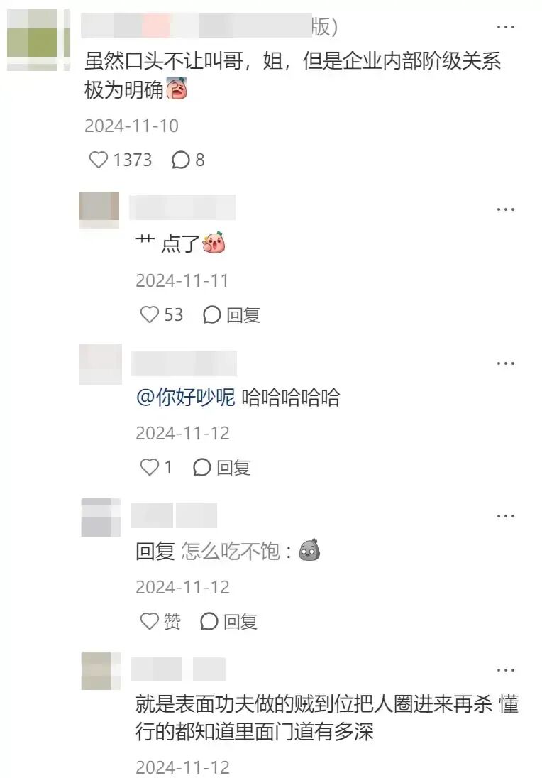 所以,员工们该懂的都懂:理想很丰满,现实很骨感。花名制度并没有从根本上消除企业内部的职级关系,球球说,“在进(蚂蚁集团)之前,我确实也会以为大家会叫花名比较多,但基本上处于闲置状态了。”在她的组里,大家更倾向于叫真名,或者“XX姐”,对自己的领导还是得叫“老板”。