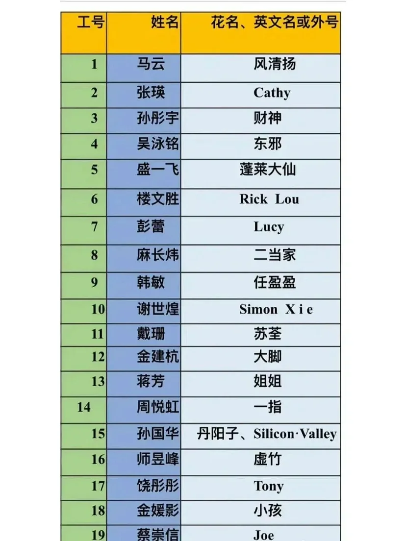 阿里巴巴是国内最早在公司内部使用花名制度的公司,从2003年淘宝创业时兴起。因为马云老师本人对金庸小说十分狂热,因此,当时的阿里员工都用武侠小说中的人名和地名给内部的组织结构、办公室和高管命名。