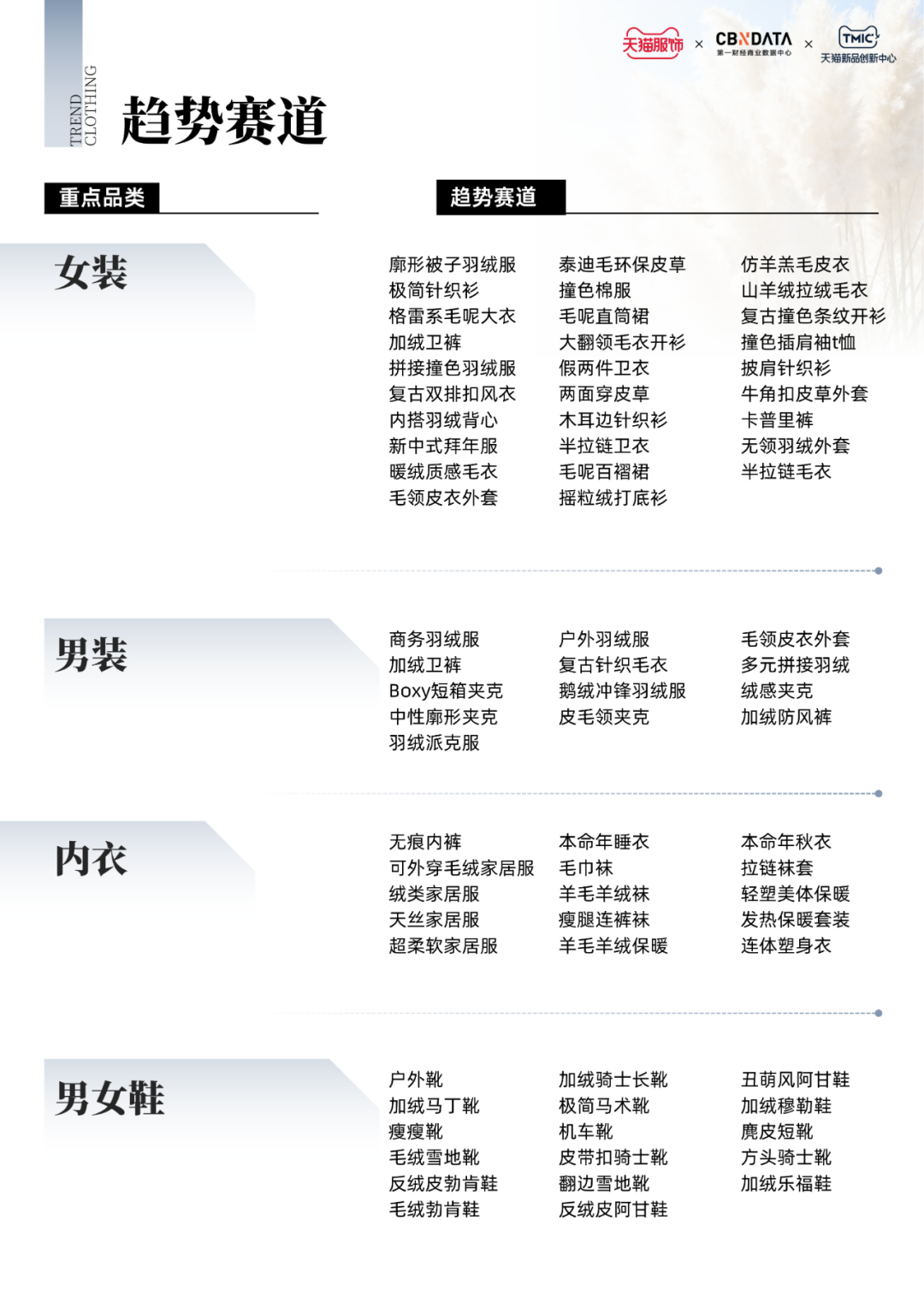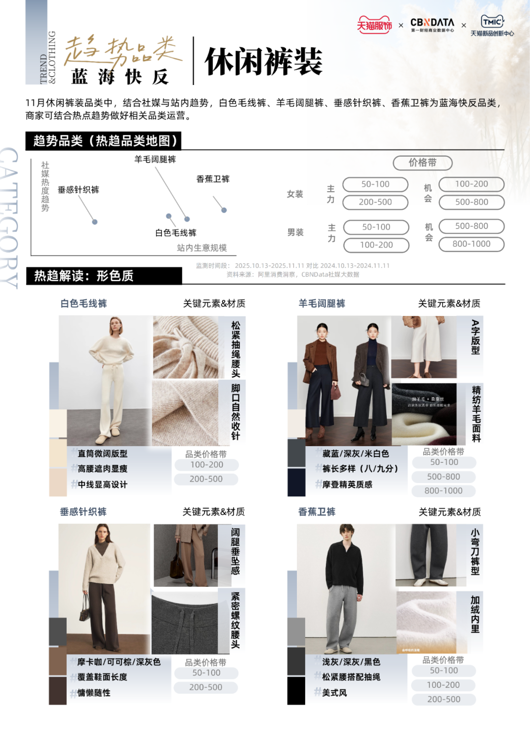 气场十足的极简廓形大衣、舒适百搭的白色毛线裤、精致轻暖的蕾丝打底衫、复古显瘦的西部堆堆靴......这些趋势单品勾勒出11月服饰趋势热点。除了对于上述四大重点趋势品类的解析,《报告》还基于社交媒体热度、市场消费规模以及供需状况,聚焦女装、男装、内衣、箱包配饰等品类,围绕细分趋势赛道挖掘潜力单品,提供服饰消费的前瞻性动态。