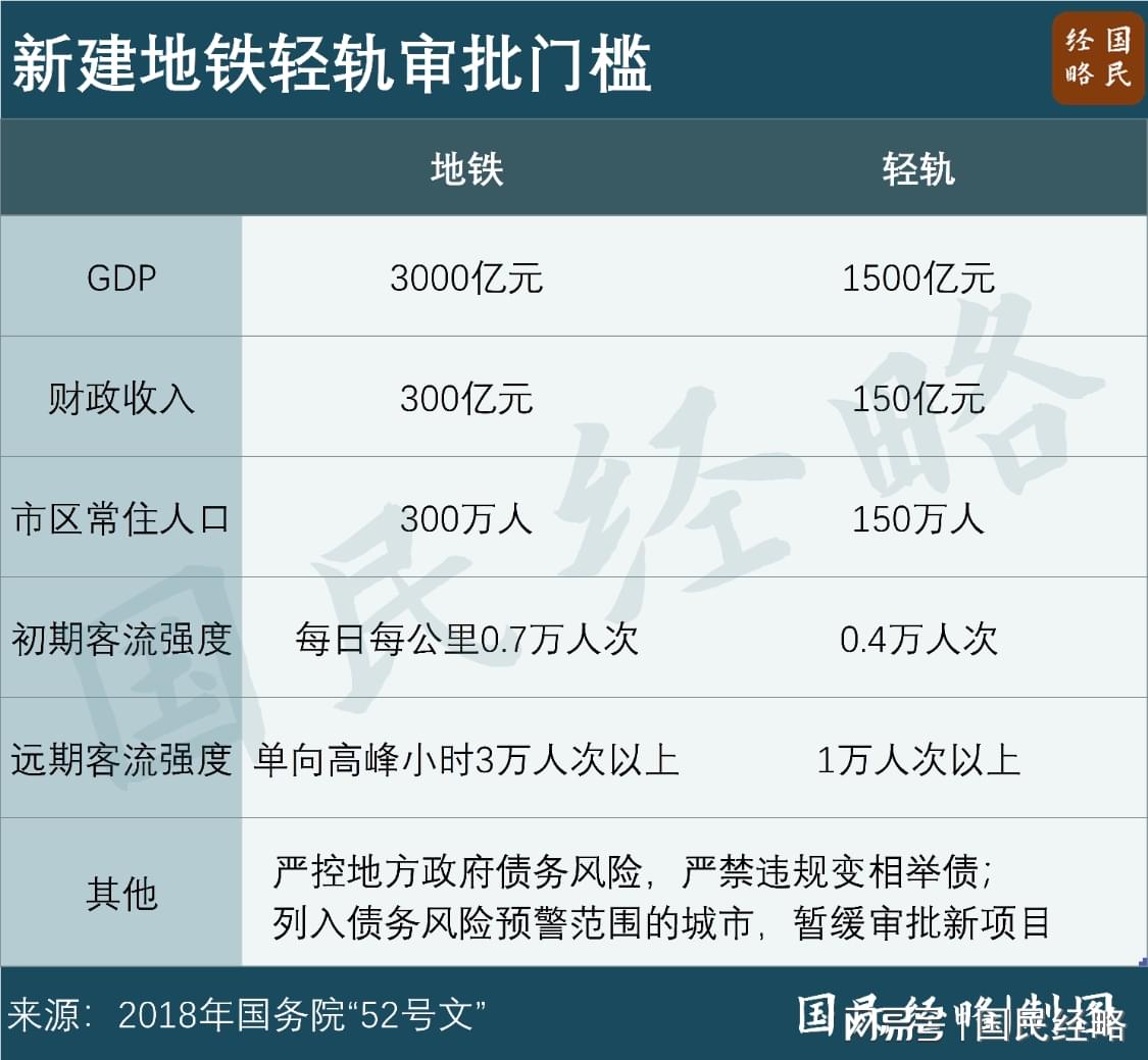 根据“52号文”,地铁建设需满足GDP超3000亿元、财政超300亿元、市区人口超300万人等三大硬性门槛。