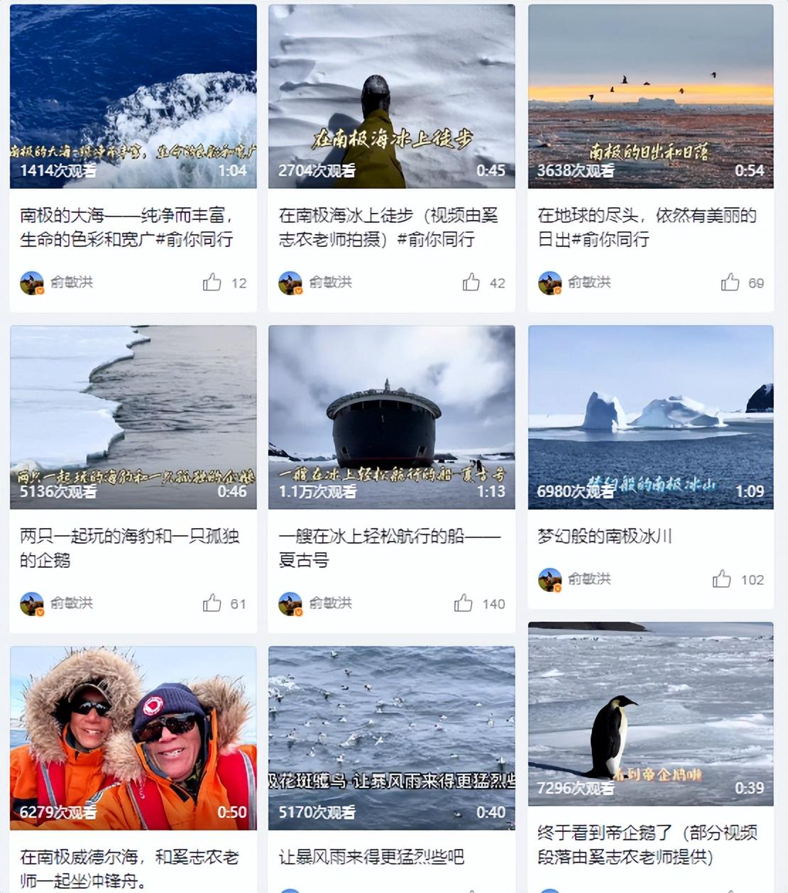 视频中,俞敏洪分享了自己穿越德雷克海峡、在南极威德尔海坐冲锋舟、乘坐夏古号邮轮在冰上航行等旅行视频。