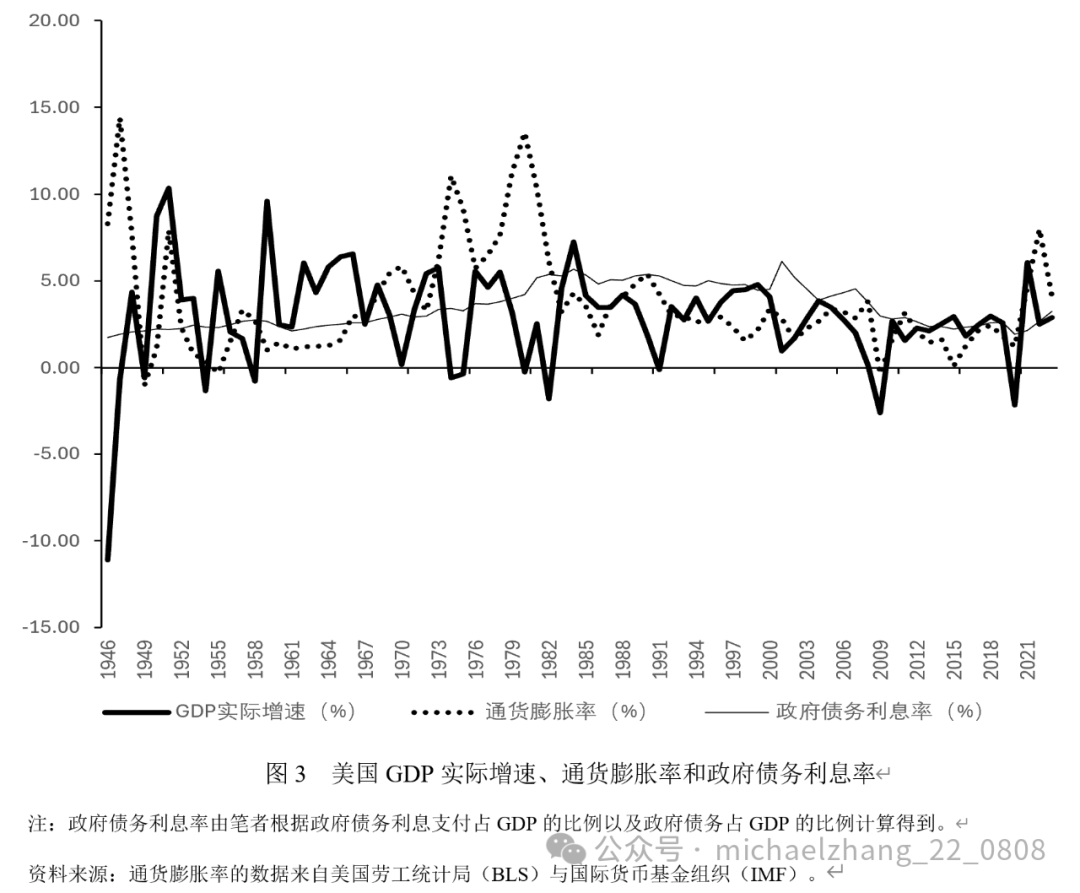 在朝鲜战争、越南战争和两次石油危机期间,政府债务的绝对规模均显著上升,但政府债务占GDP的比例长期呈现下降态势。主要原因在于:首先,在上述期间美国财政状况并未显著恶化,长期保持基本盈余,仅在极少数年份出现较小幅度的基本赤字。其次,在朝鲜战争和越南战争期间,美国GDP实际增速和通货膨胀率较高,使得政府债务被经济增长和货币贬值“蒸发”,加之此时政府债务利息率相对较低,因此政府债务占GDP的比例呈下降态势。在两次石油危机期间,美国经济进入“滞胀”,虽然GDP实际增速较低且政府债务利息率上升,但极高的通货膨胀率同样使得政府债务占GDP的比例下降。